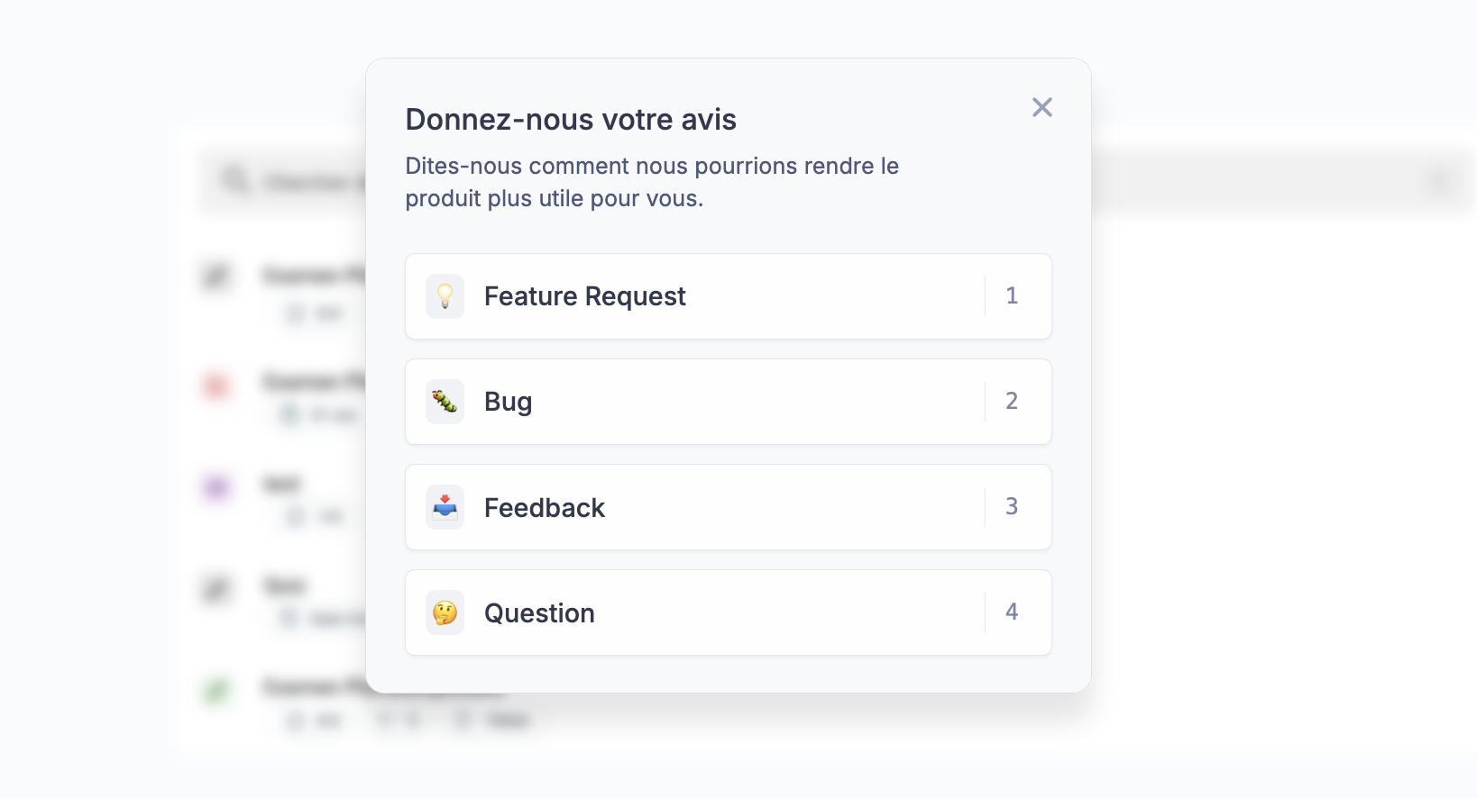 Nous simplifions la collecte de vos suggestions ! En quelques clics, partagez vos idées et votez pour les propositions des autres utilisateurs. Vous recevrez une notification dès que vos suggestions passent en développement ou sont mises en ligne, pour un suivi en temps réel de votre impact sur l’application.
